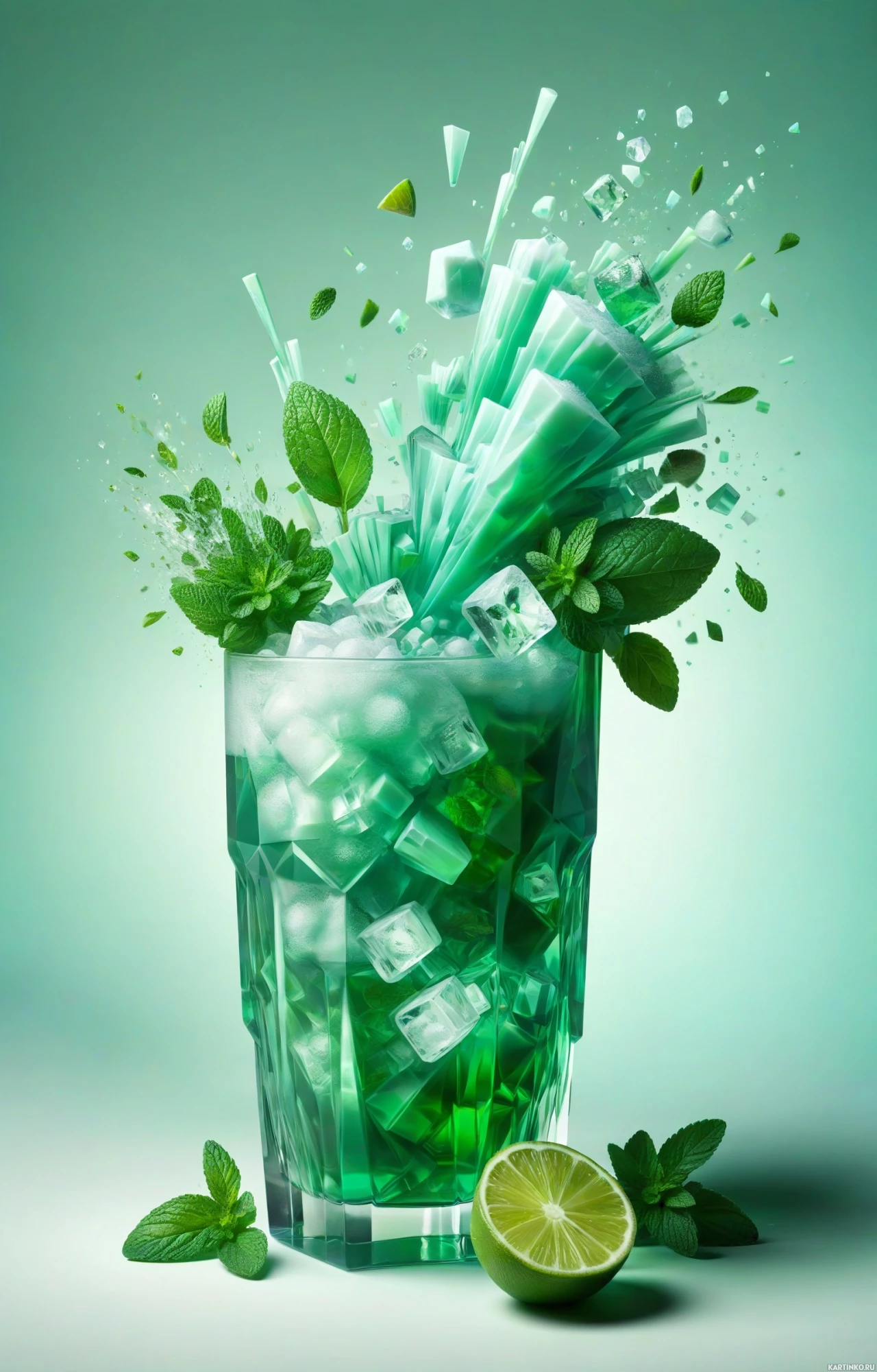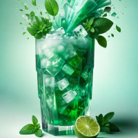 a refreshing drink, likely containing mint leaves and possibly some fizz or ice. It is presented in a way that suggests it might be a mint-flavored beverage, possibly with added fizz for a bubbly effect.