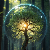 a magical scene with a large, transparent bubble containing a tree inside. The tree is vibrant and full of life, with