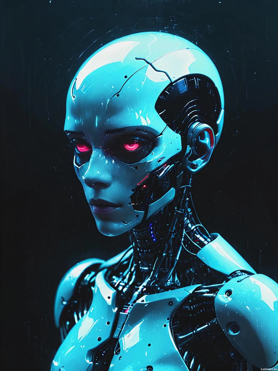 На картинке изображен гуманоидный робот с гладким, металлически-синим корпусом и сложными механическими деталями, намекающими на передовые технологии. Его глаза красные, а выражение лица нейтральное, словно отражающее невозможность выражения эмоций машиной. На заднем плане – темный фон с едва заметными космическими элементами, подчеркивающими научно-фантастический жанр картинки.