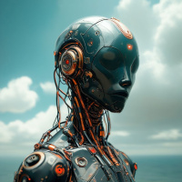 blue sky with white clouds, which contrasts with the metallic figure of the robot, emphasizing its artificial nature. The overall style is reminiscent of