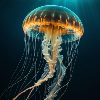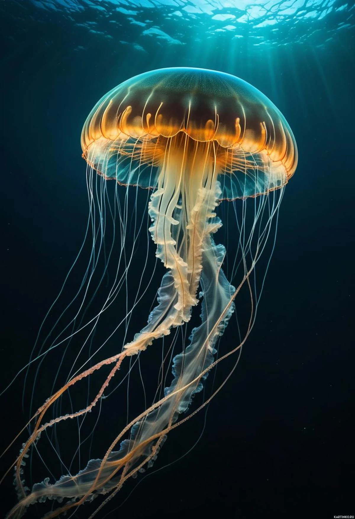 an underwater scene with a prominent jellyfish in focus. The jellyfish has a large bell-