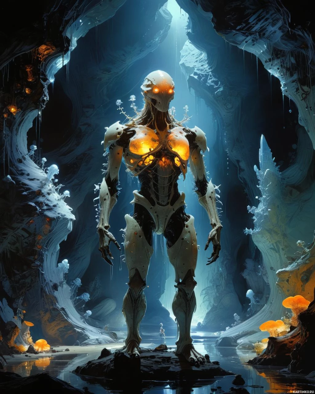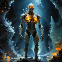 fiction scene with an alien character standing within a cave. The alien, which appears to be humanoid, is wearing
