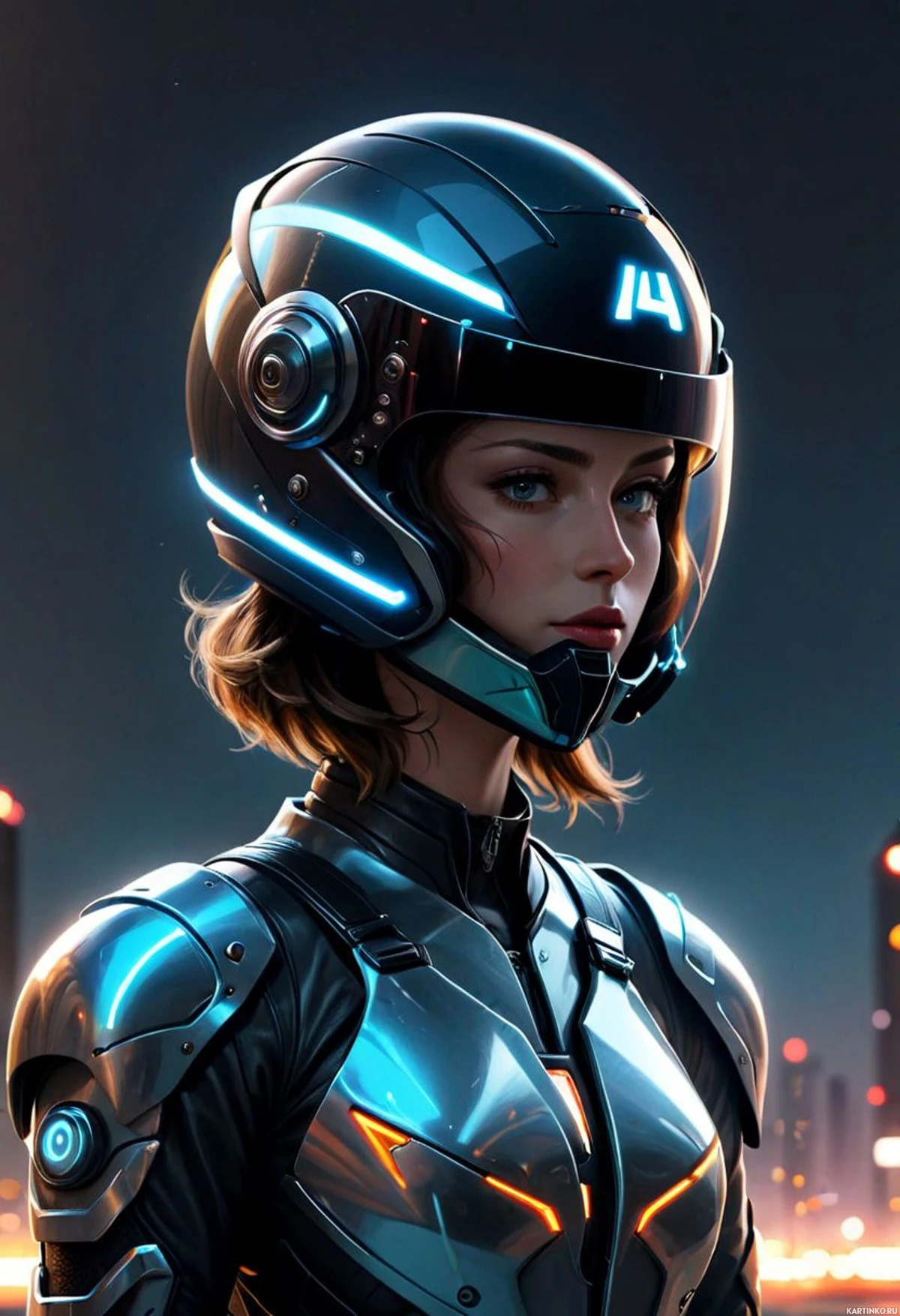 advanced technology features, such as speakers and possibly other communication devices integrated into the design. The background suggests an urban environment at night, with neon lights and a high-rise cityscape visible in the distance, adding to