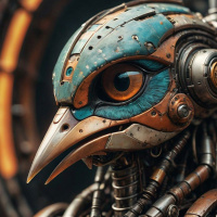 large eyes and a pointed beak. The robot's body is humanoid in form, with visible