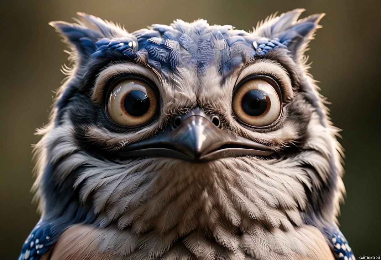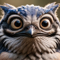 expressive eyes and a detailed plumage with various shades of blue and white. The owl is characterized by its distinct