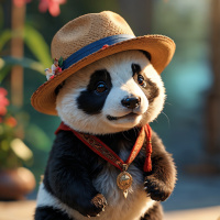 На картинке изображен мультяшный панда, похоже, совсем юный, в соломенной шляпе, украшенной цветами. У панды голубая ленточка на шее, и он улыбается, видно зубы. Он сидит на полу, словно выложенном из камня, на заднем плане стоит глиняный горшок. Стиль картинки напоминает кадр из мультфильма или сериала.