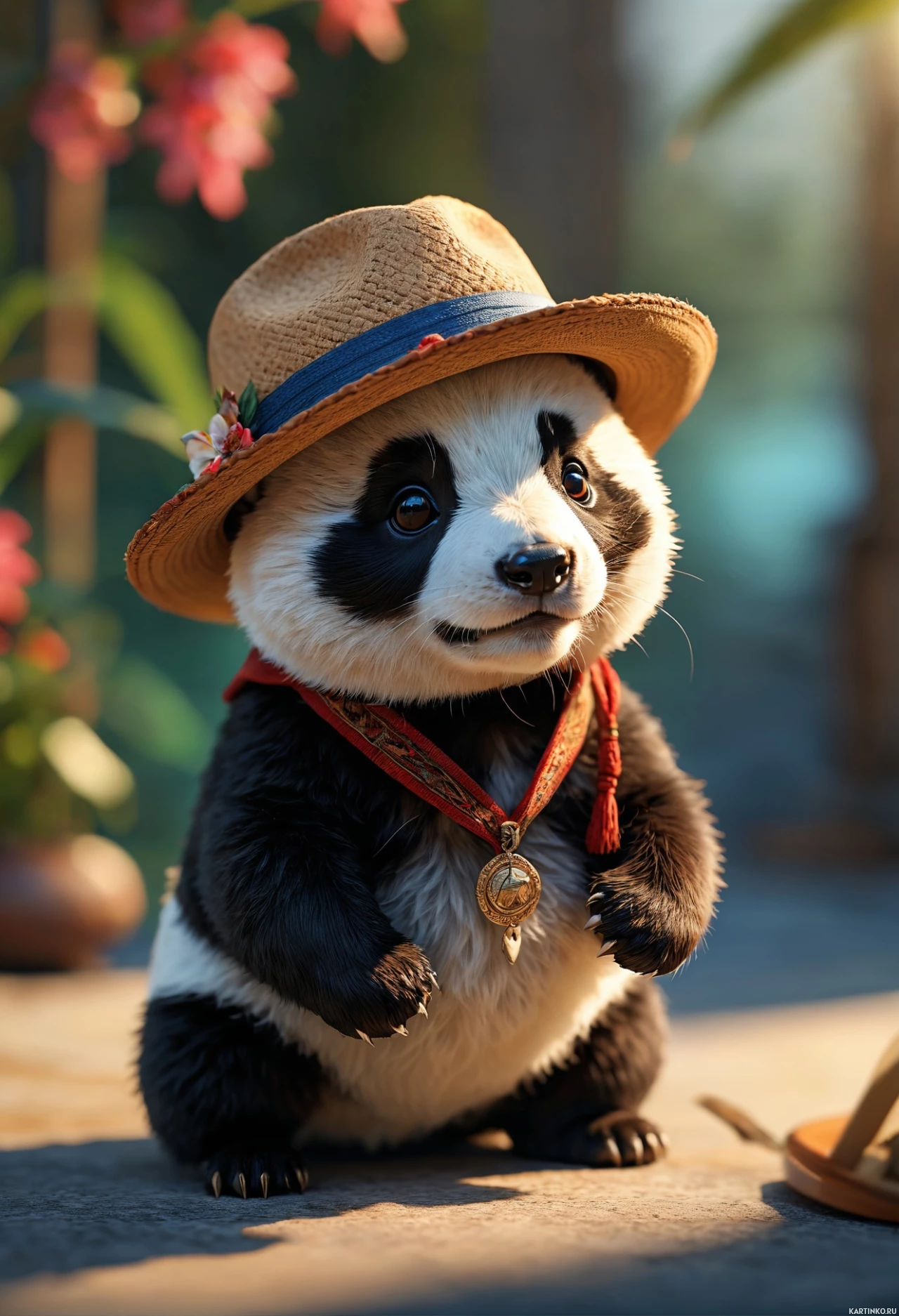 The image depicts an animated character that appears to be a young panda wearing a straw hat with flowers. The panda has a blue ribbon around its neck and is smiling, showing teeth. It is seated on what looks like a stone floor with a wooden pot in the background. The style of the image suggests it could be from an animated film or series.