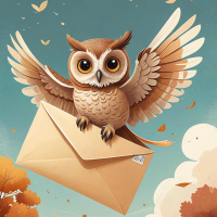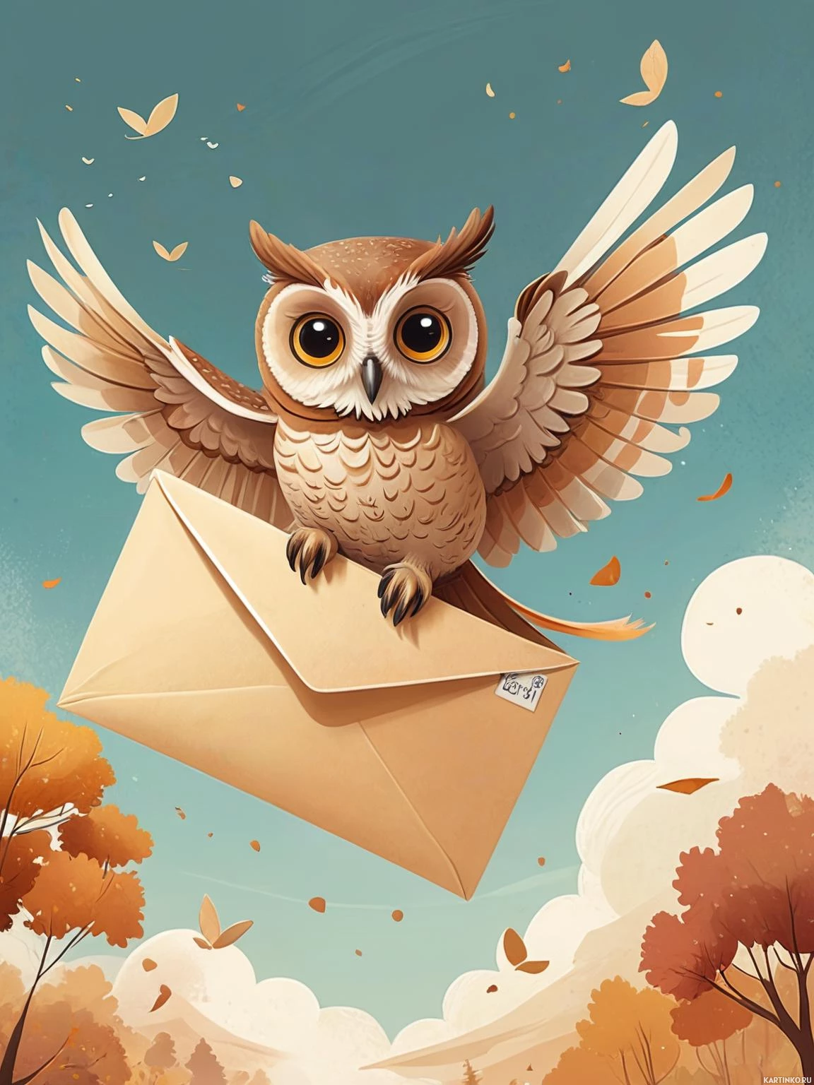 large wings that are spread out, giving it the appearance of being in flight. In its talons, it holds a letter. There is a subtle background that suggests a seasonal change with trees and what looks like