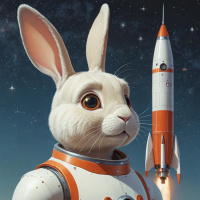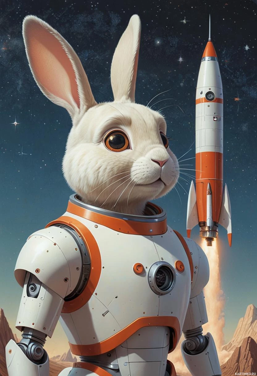 advanced technology or space exploration theme. To the left of the rabbit is an orange rocket, which also features human-like elements like hands on its surface and a small white flame at its tip, indicating motion or functioning. The background of the image shows a starry