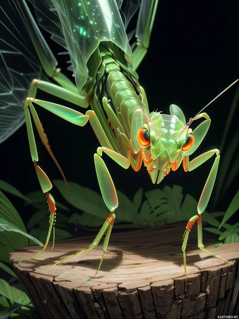 The image features a vividly colored insect with a striking appearance. It has wings that are translucent, allowing a view of its