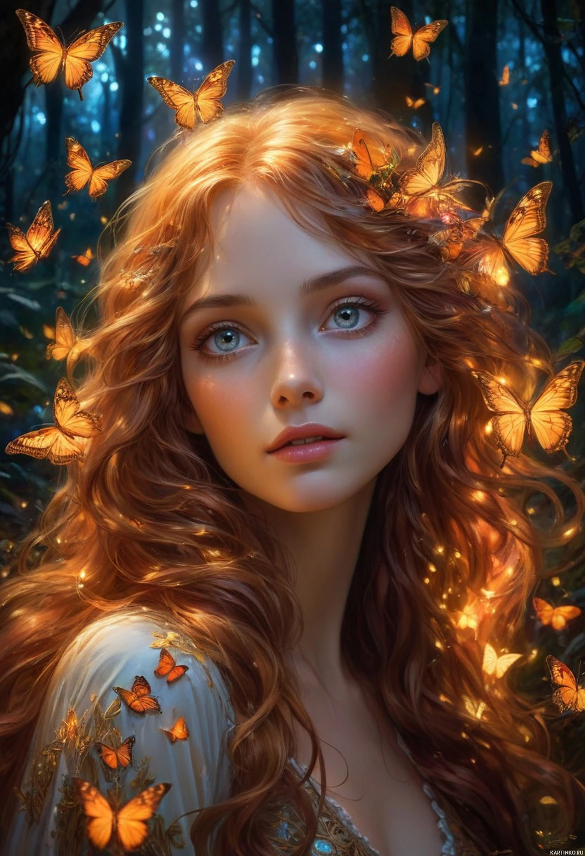 blue eyes that capture attention. Her lips are slightly parted as if she is about to speak or sing. She is adorned with butterflies; one rests on her nose as if it were a flower made of the delicate creatures themselves. Another group of butterflies flutter around her hair, adding