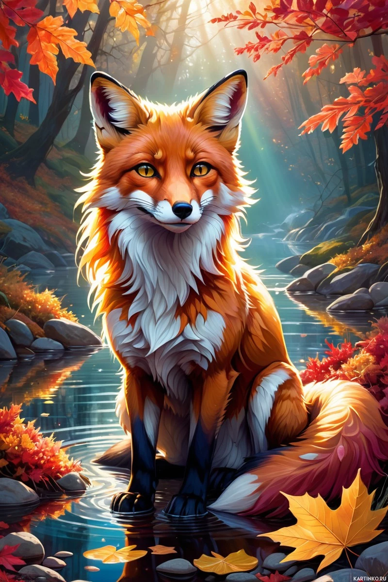 This image features a stylized illustration of a fox in a natural, autumn-themed environment. The fox is depicted with vibrant orange and red fur, standing upright on its