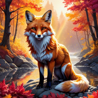 red coat with white markings around its eyes and ears, typical of many fox species. Its fur looks soft and well-groomed, suggesting a healthy animal. The fox is positioned facing the viewer, with its body oriented towards the left side of the image. The background depicts a picturesque