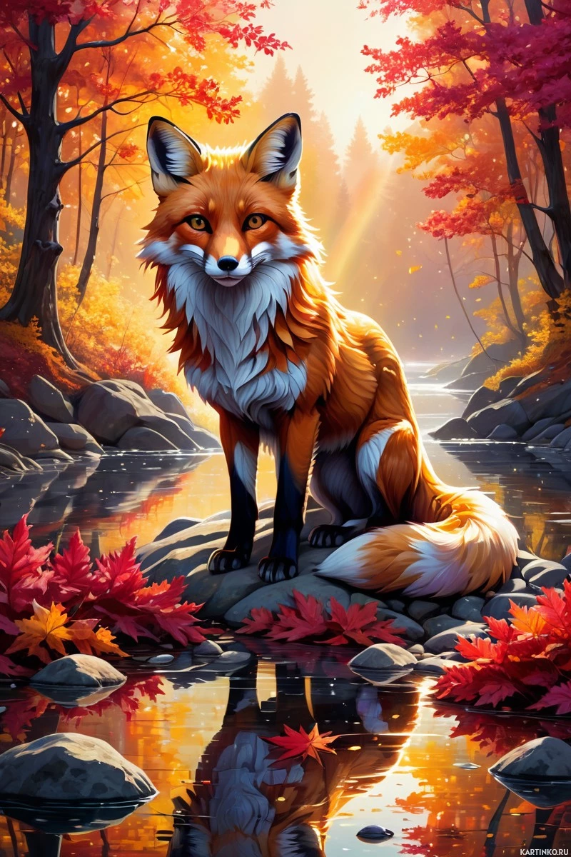 shades of orange, yellow, and red, indicating the season's transformation. A small stream meanders through the foreground on the left side of the image, reflecting light that suggests either dawn or dusk due to