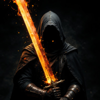 На картинке изображён персонаж в средневековой одежде, в капюшоне и плаще. Он держит меч, из клинка которого вырываются языки пламени. В целом, картинка похожа на иллюстрацию или произведение искусства, изображающее воина или персонажа из мира фэнтези.