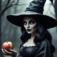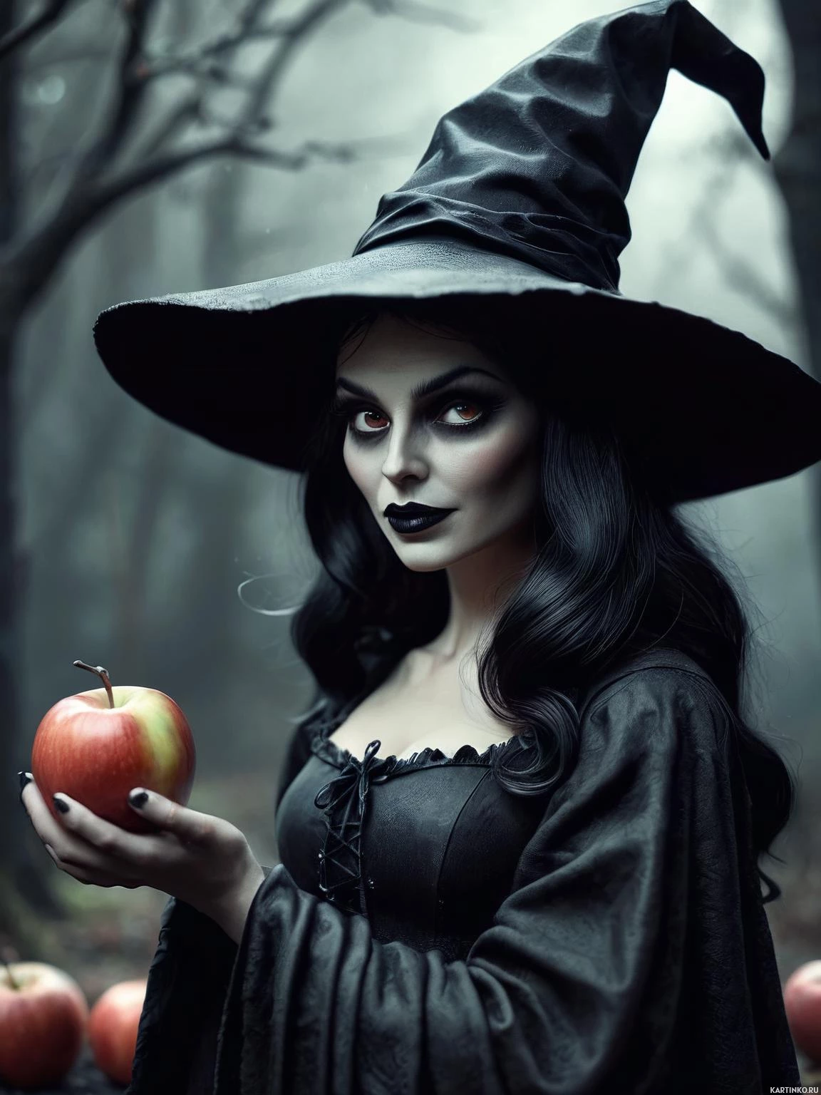 a black dress, which are elements of fantasy or witch-themed attire. She is holding an apple in her hand, suggesting that she might be portraying
