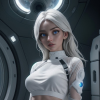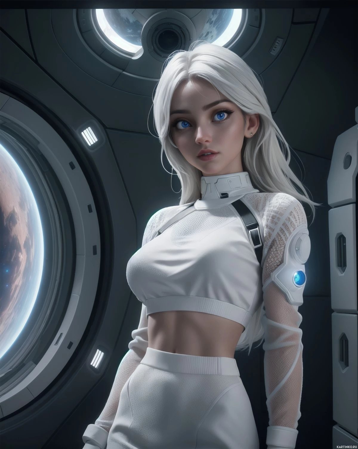 large windows displaying the Earth and the moon, indicating a cosmic theme. The interior of the ship includes various control panels and screens, emphasizing a high-tech environment.
