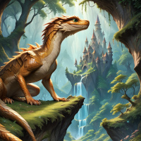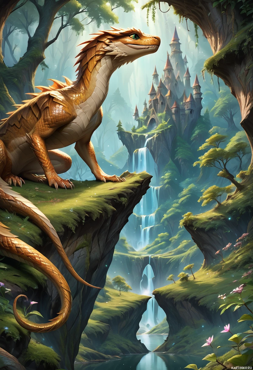 Rolling hills and verdant trees stretch out beneath the open sky. A mountain range looms in the distance, capped with snow that gleams under the sunlight. Tucked away among these natural elements is a castle. Its architecture seems traditional and well-maintained, suggesting it might be significant to the story or setting of this fantasy world. The castle is not prominently featured but its presence adds an element of mystery and intrigue to the scene. The overall mood conveyed by the image is one of tranquility and enchantment, typical of a fairy-tale or fantasy setting. The dragon, while not directly interacting with the surrounding environment, seems to be observing it all, adding a sense of life and activity to the scene.