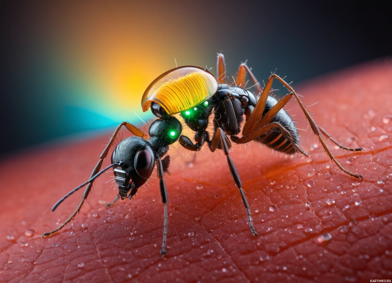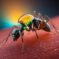 The image shows a close-up of an insect, which appears to be a bee. It is characterized by its six legs, two wings, and segmented antennae. This particular specimen exhibits a range of colors from dark brown or black on the body to lighter shades such as cream or yellow on the wings and underside. The bee is perched atop what seems to be a blood orange, given the bright