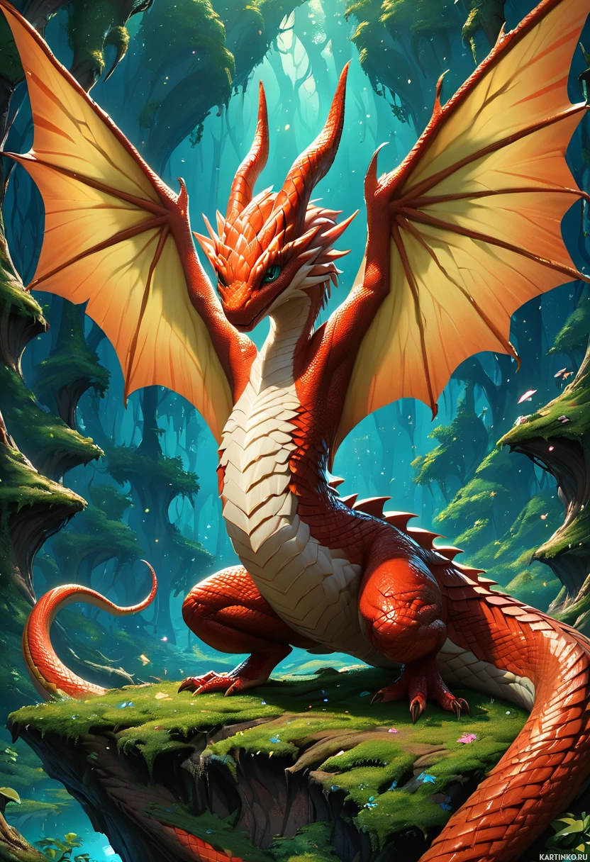 a fantasy scene featuring a dragon. The dragon, which is red with a spiked tail and wings, is sitting atop