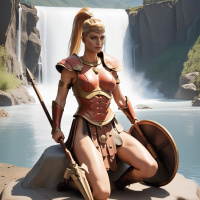 blonde hair and is depicted wearing a helmet with a feather plume on top, which suggests a warrior or heroic theme. She is holding a spear in her right hand and a shield in her left. Her pose indicates she is kneeling down next to a small