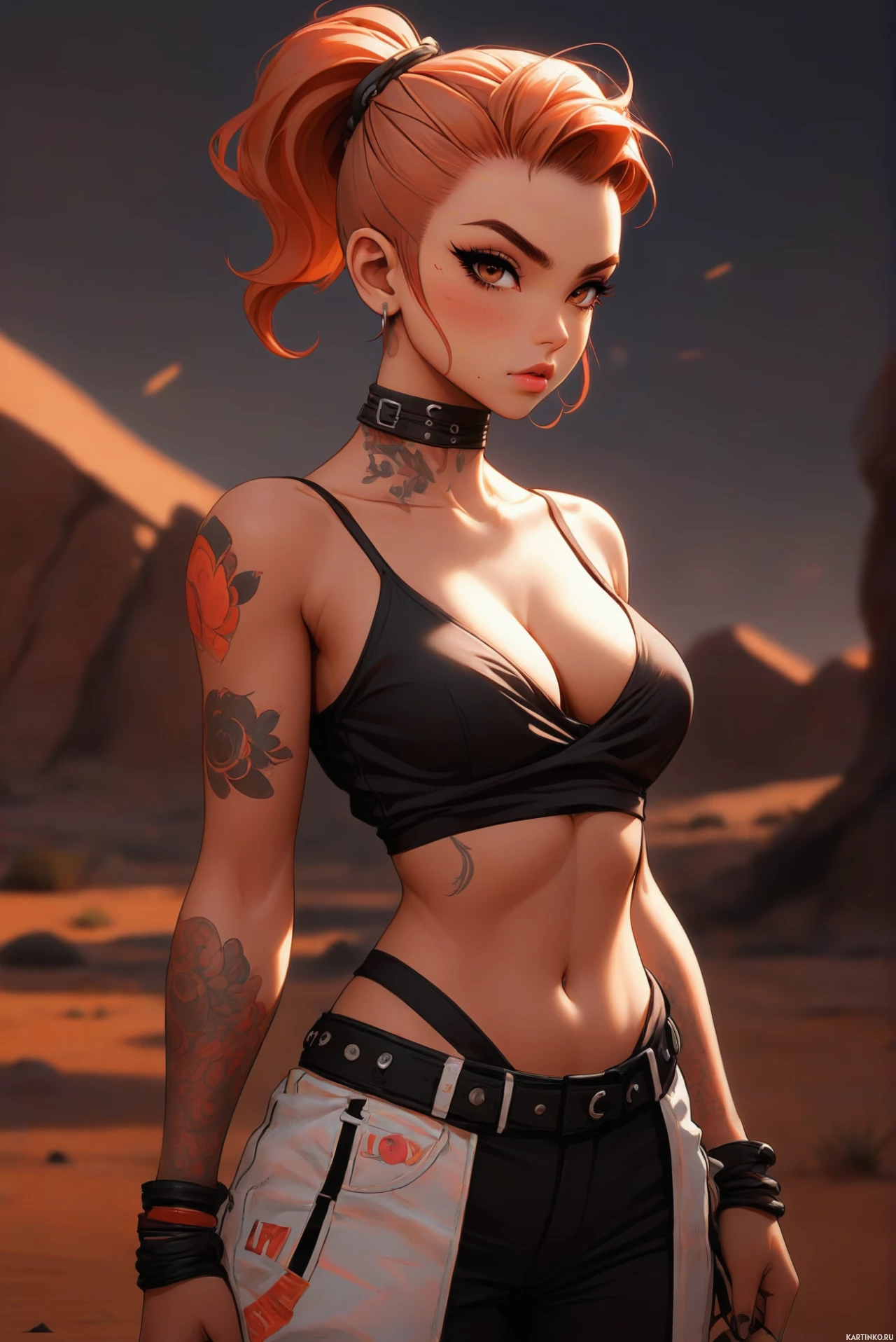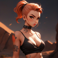 На картинке изображена женщина с рыжими волосами, собранными в два высоких хвостика, в черной майке и джинсах. На правом плече видны татуировки. Она стоит на фоне пейзажа, похожего на инопланетную пустыню, с каменными образованиями и красно-коричневым небом, которое намекает на рассвет или закат. У женщины нейтральное выражение лица, и она смотрит прямо на зрителя.