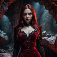 underground chamber with rocky walls and a small entrance in the background, suggesting a fantasy or supernatural theme. The character's attire and the environment give off a dark fantasy vibe, possibly indicating she is from