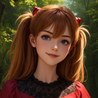 a red dress and has a bow on her head, which suggests she might be inspired by the character Asuka Langley from the anime series "Neon Genesis Evangelion." Her expression is calm and composed as she stands against a backdrop of