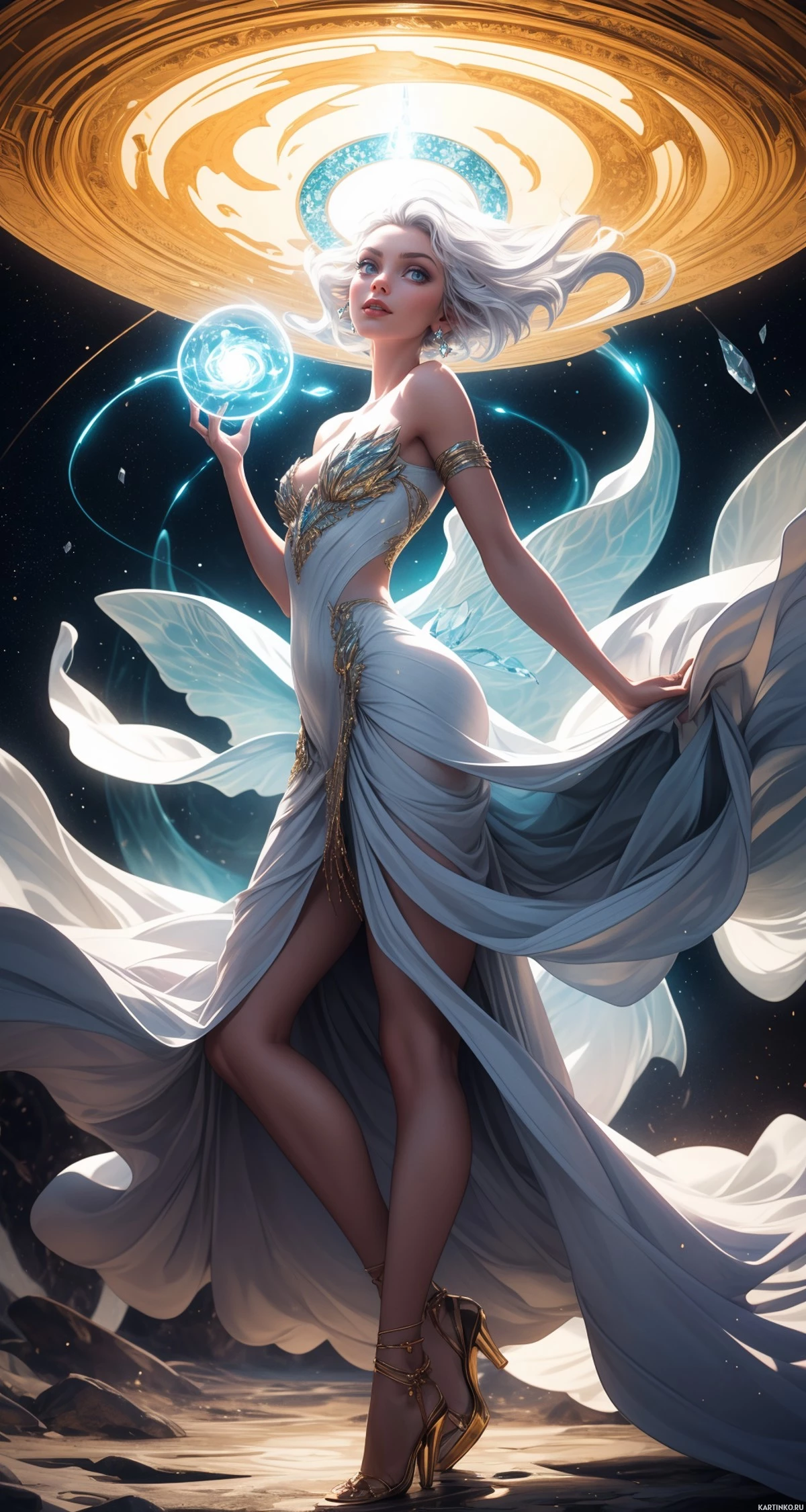 white hair, dressed in an ornate gown with feathered and metallic details. She stands on one leg with her other leg gracefully raised in front of her. Her left hand is holding what appears to be a gem or crystal, while her right hand is open as if she is invoking something. The figure's gaze is directed upwards, and the background showcases a celestial scene with stars, a crescent moon, and what seems to be a portal or gateway that emits