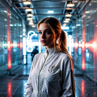 ambiance of the scene. The lighting highlights her features while also casting shadows that add depth to the image.