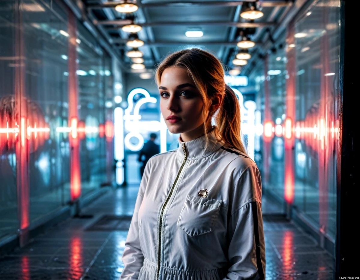 defined eyebrows and dark lipstick. The woman's expression is neutral, and she seems to be looking slightly off-camera. The background shows a modern architectural setting with illuminated signs and glowing red lights, contributing to the nocturnal