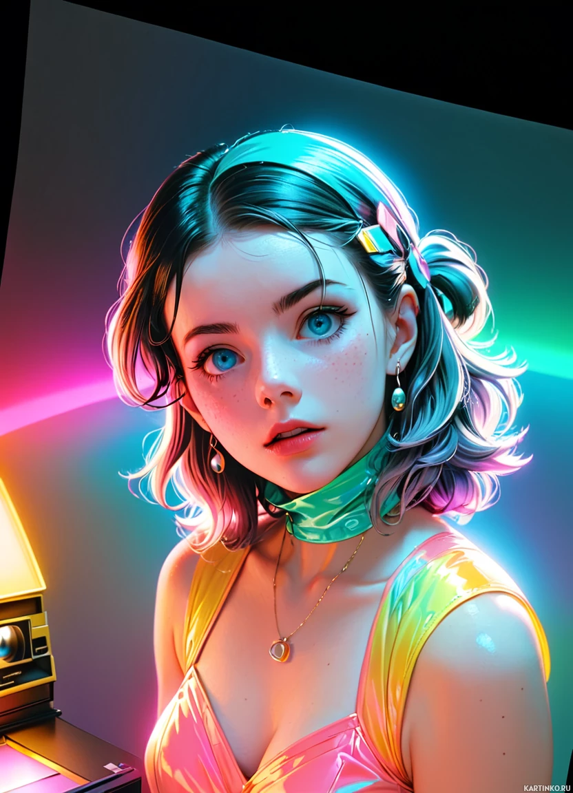 light skin and is wearing what appears to be cyberpunk-style clothing, consisting of a pink bodysuit with straps over the shoulders, and a yellow utility belt around her waist. Her