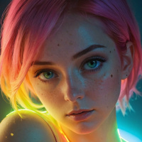 vibrant colors in her surroundings, with what appears to be magical sparkles or light particles floating around her, adding to the fantastical and whimsical nature of the image. The artwork itself is detailed, showcasing a high level of skill in digital illustration.