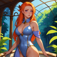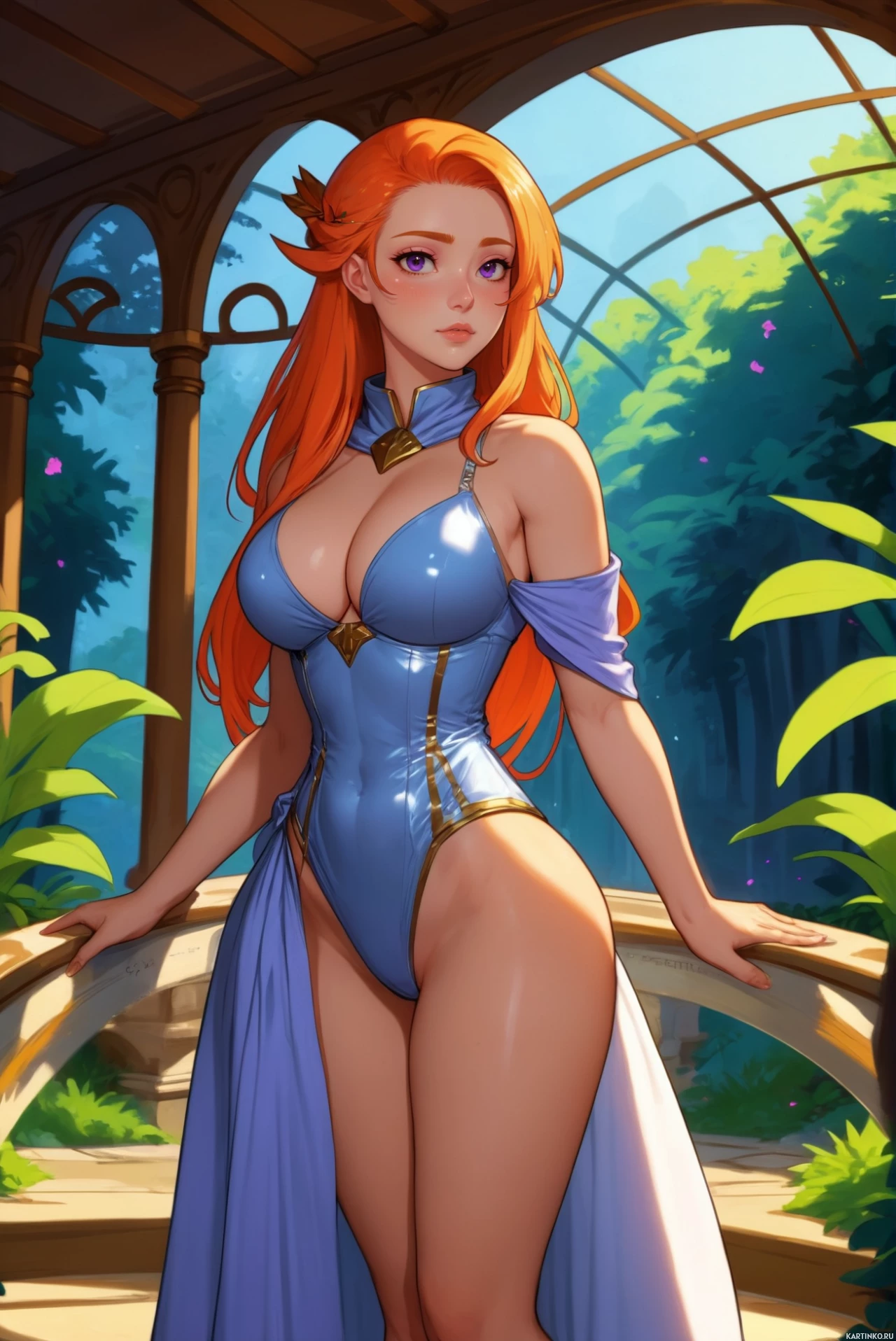 На картинке изображена девушка с рыжими волосами. На ней обтягивающий комбинезон, словно из блестящего металла или пластика. Дизайн комбинезона детализированный, похоже на доспехи. В цветовой гамме наряда присутствуют оттенки синего и золотого. Она стоит прямо, руки опираются на край каменной конструкции. За ней виден арочный проем, обрамляющий часть фона. Кажется, действие происходит в помещении, стилизованном под классический или фантазийный интерьер.