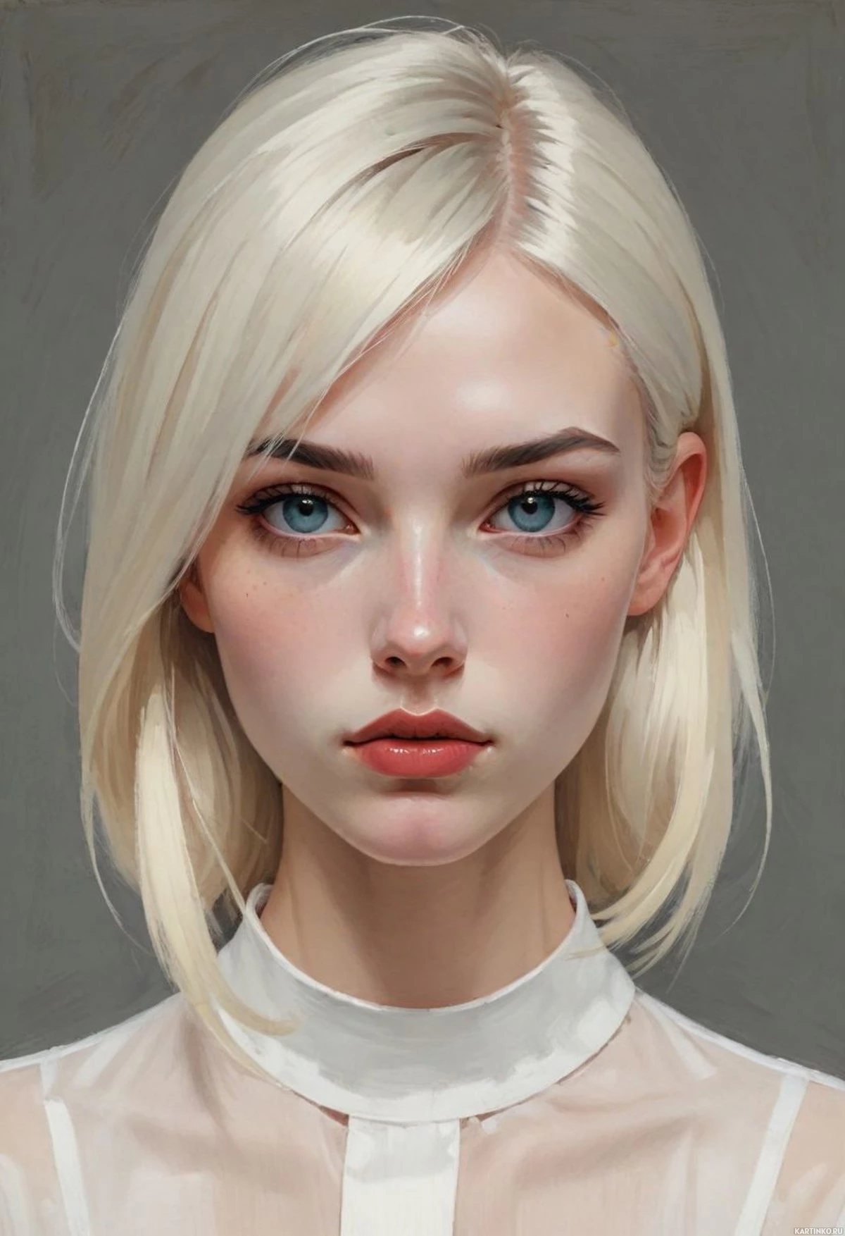 fair skin and her eyes are blue. Her makeup is subtle, emphasizing her natural features. The character appears to be wearing a light-colored