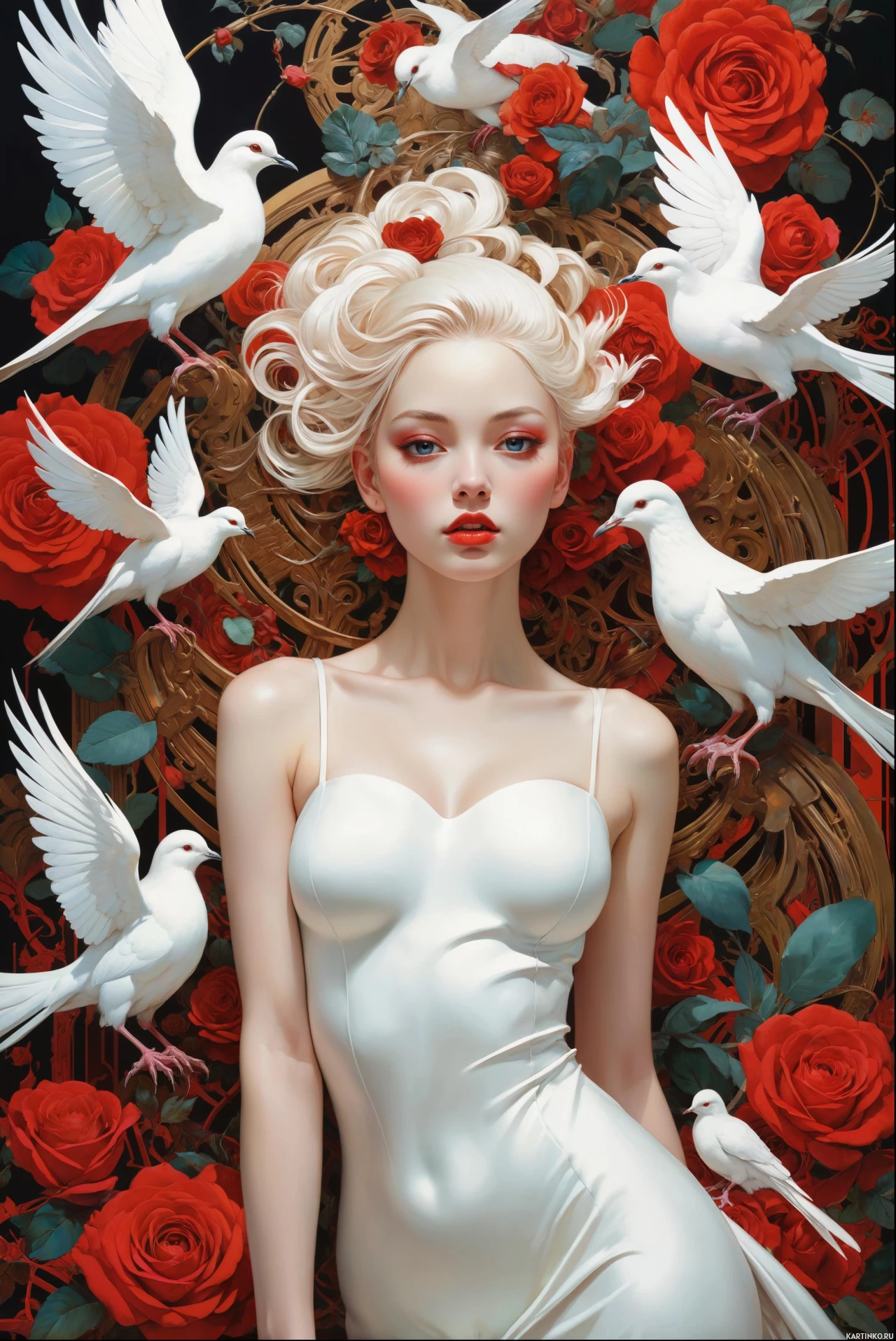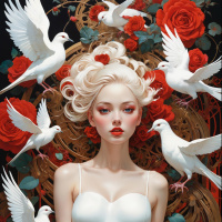 red roses in the background, along with other floral elements, and multiple pigeons flying around her. The overall style of the artwork suggests it could be related to fantasy or romantic themes.
