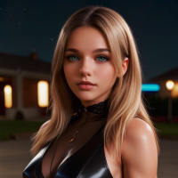 blonde hair and is wearing a black leather outfit with lace detailing at the neckline. The setting appears to be an urban