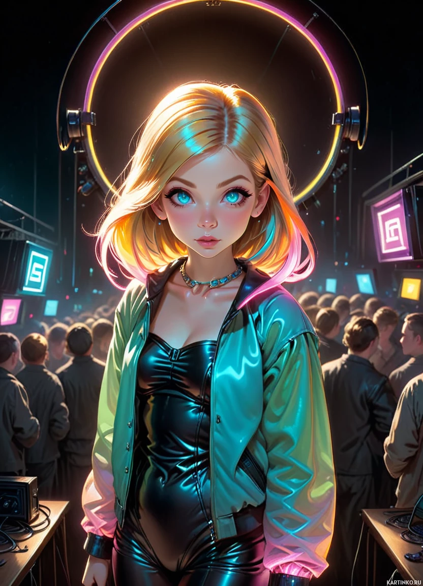 Женщина в трикотажном костюме с металлическими элементами стоит в помещении, напоминающем индустриальную обстановку, возможно, цех или студию. Свет отбрасывает тени позади неё, на её лице – сосредоточенное выражение. Вокруг неё люди в темной одежде, сидящие за столами с компьютерными мониторами. Вся обстановка наводит на мысль о каком-то футуристическом или тематическом мероприятии.