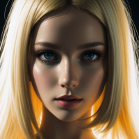 a female character. She is depicted with blonde hair and blue eyes, which are commonly associated with beauty in human portrayals. Her expression is neutral to slightly contemplative, and she appears to be looking directly at the viewer. The lighting and shadows suggest that the figure is lit from the front, giving