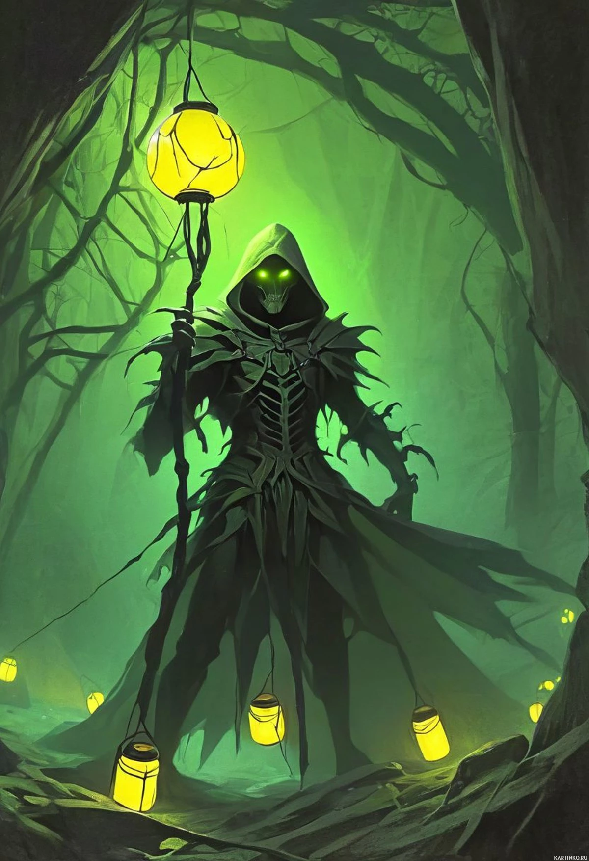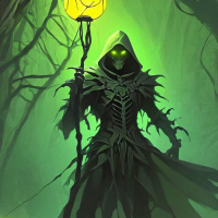 a hooded cloak and holds a staff in one hand, suggesting they may have magical abilities. Their face is obscured by the hood, adding