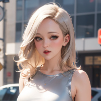 a sheer top paired with high-waisted jeans. Around her neck, she has on multiple chains that seem to be part of a statement necklace. The street setting includes various elements like traffic lights and storefronts in the background, indicating