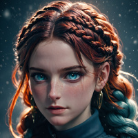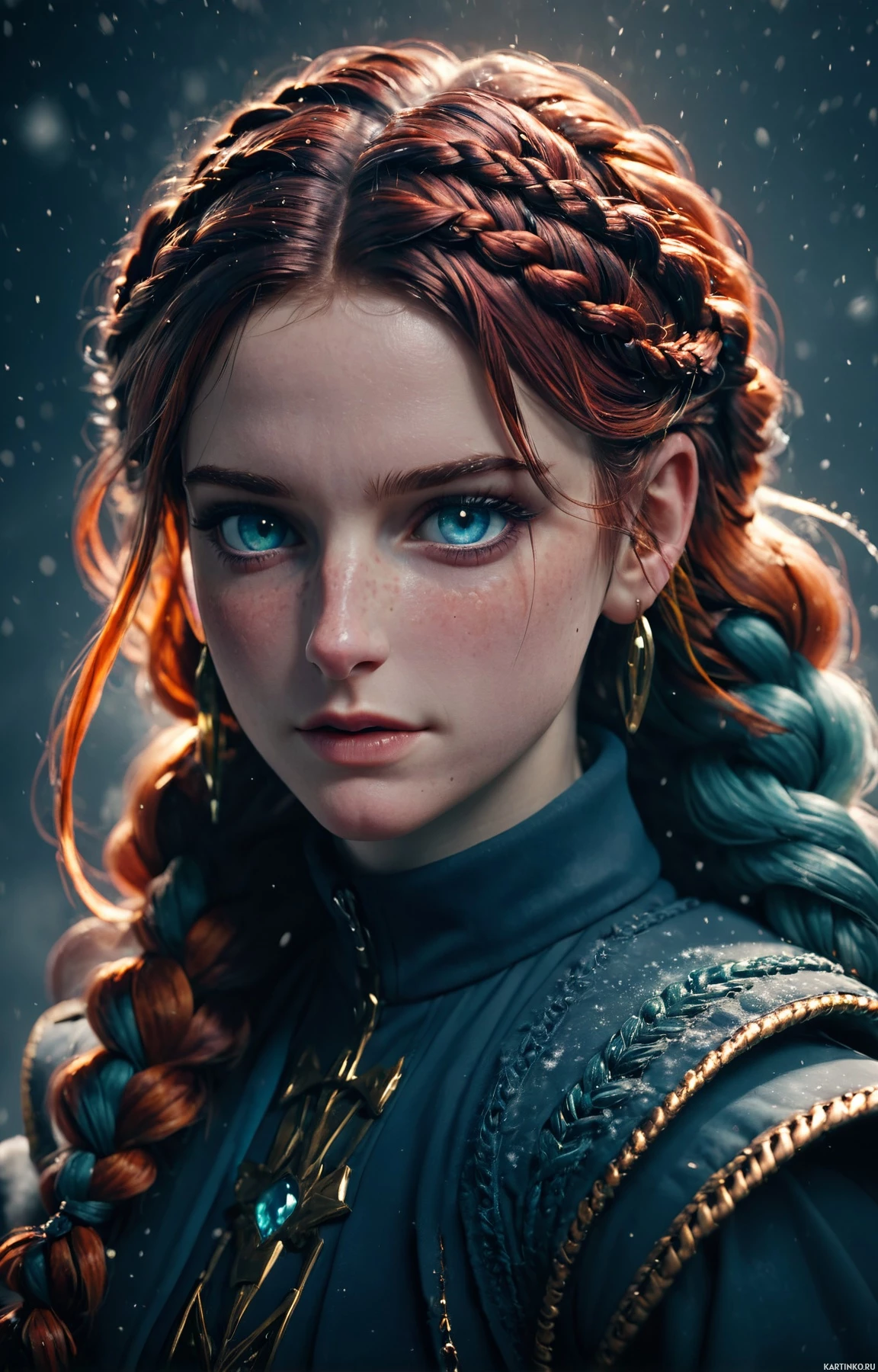 На картинке изображена девушка с ослепительно-рыжими волосами, заплетенными в косы. Её взгляд направлен в сторону, придавая ей задумчивый и созерцательный вид. У неё светлая кожа, и она украшена украшениями – серьгами и ожерельем. Её наряд выглядит как доспехи с текстурой, напоминающей кольчугу на плечах, что указывает на фэнтезийный сеттинг. Фон имеет неземную атмосферу с мягко размытыми звёздами, что добавляет общей мистической ауре картинки.