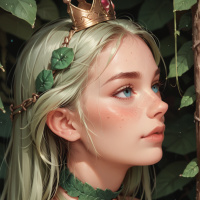 royal status or authority. Her attire consists of a top that resembles the leaves of plants, suggesting a connection to nature, and she's adorned with