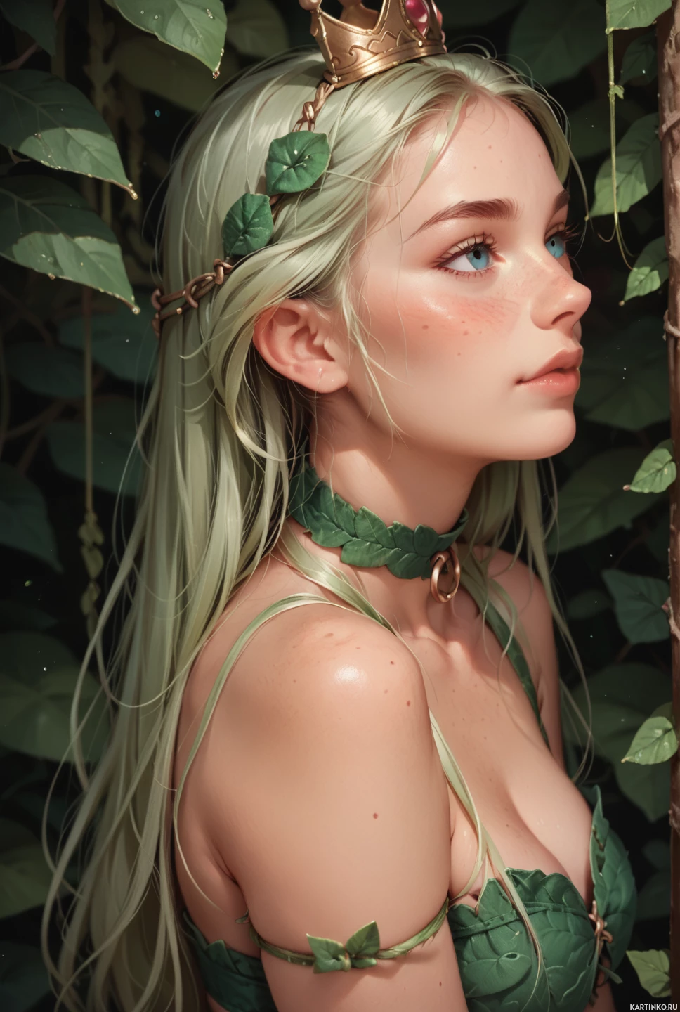 green jewelry that complements the natural theme. Surrounding her are vines, further emphasizing this
