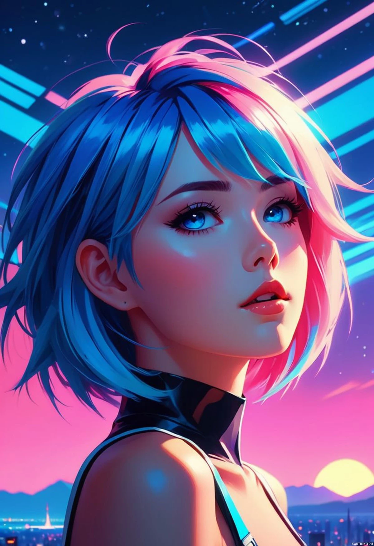 a landscape scene that includes mountains under a gradient sky that transitions from blue at the top to orange towards the horizon. The artwork has a vibrant and dynamic feel with its