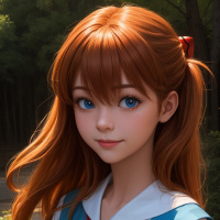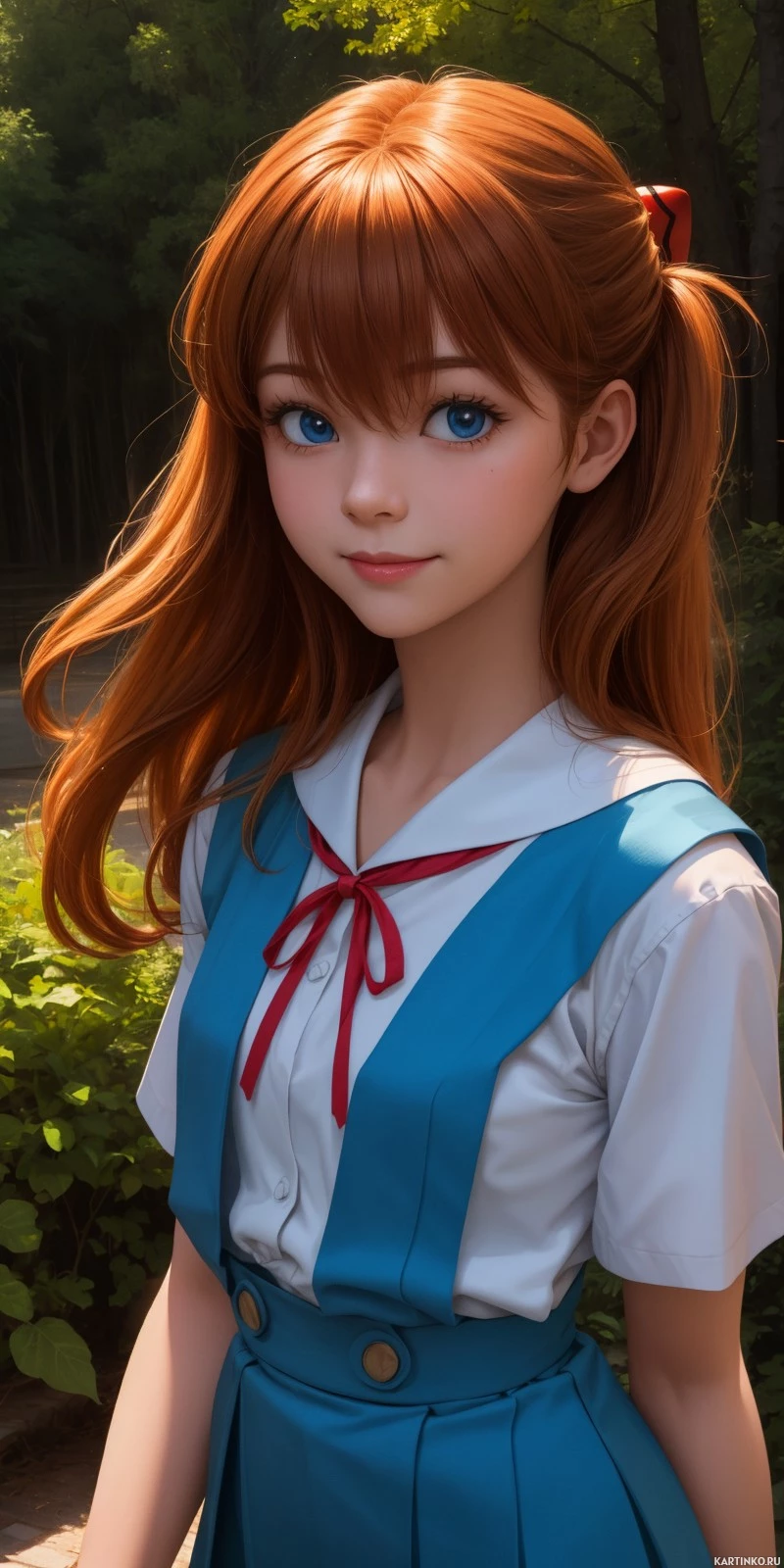 Это картинка, на которой запечатлена молодая девушка с рыжими косичками, одетая в школьную форму, включающую в себя сарайный костюм с голубым воротником и короткими рукавами. На ней белые гольфы и коричневые туфли. Фон — открытое пространство, похоже на парк или сад, с деревьями и зеленью позади неё.