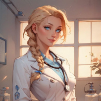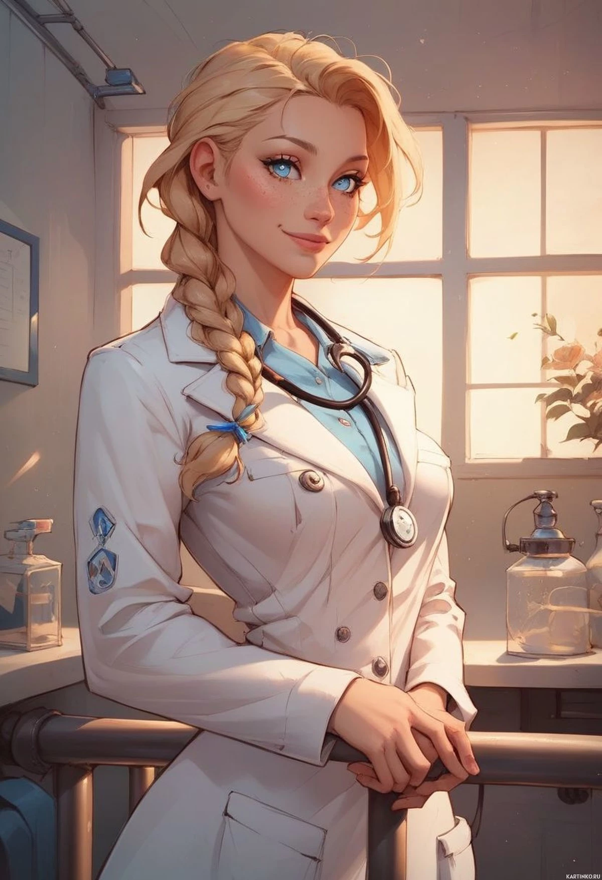 blonde hair styled in a braid. She is wearing a white lab coat over
