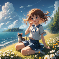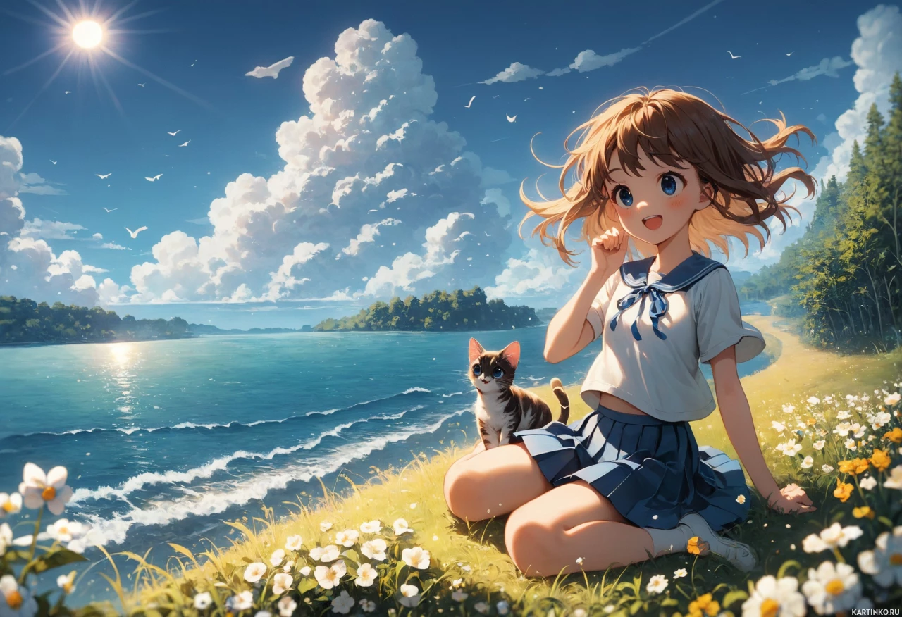 the view of the beach. Next to her is a cat, which appears to be sitting calmly on