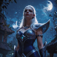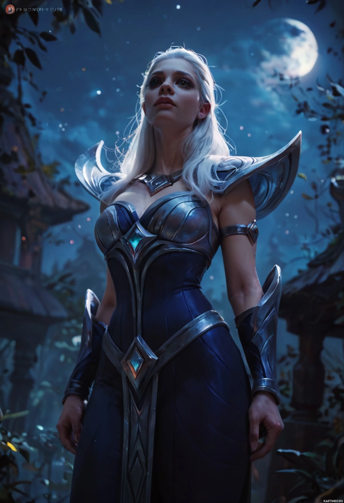 a nighttime scene with a moon in the sky, trees, and a pathway leading into the distance. There are lanterns lighting up the area, providing illumination against