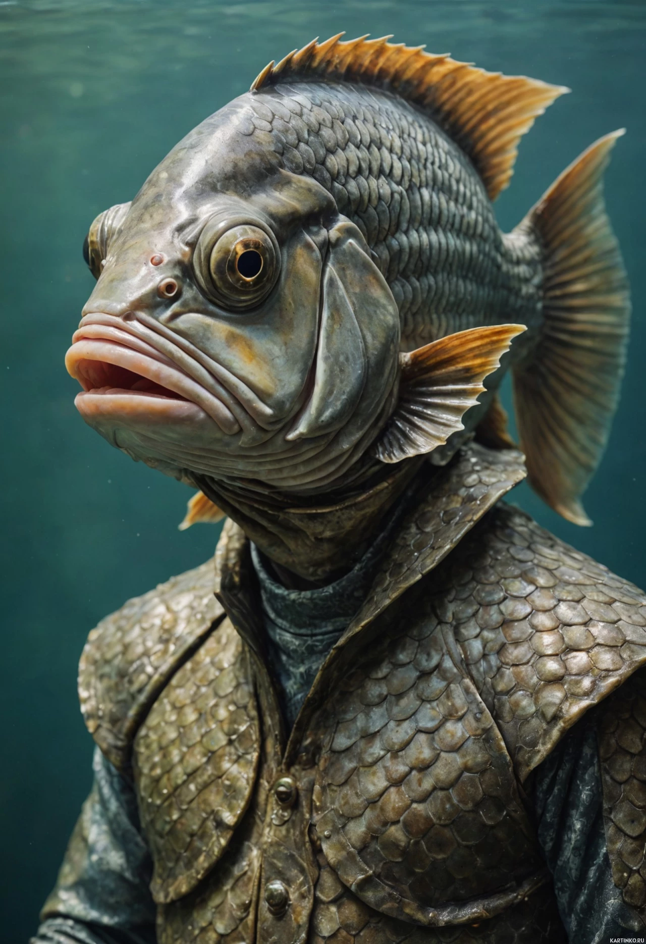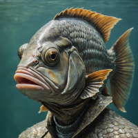 an anthropomorphic fish with human characteristics. The fish has scales, gills, and eyes that resemble those of a typical fish, but it also sports